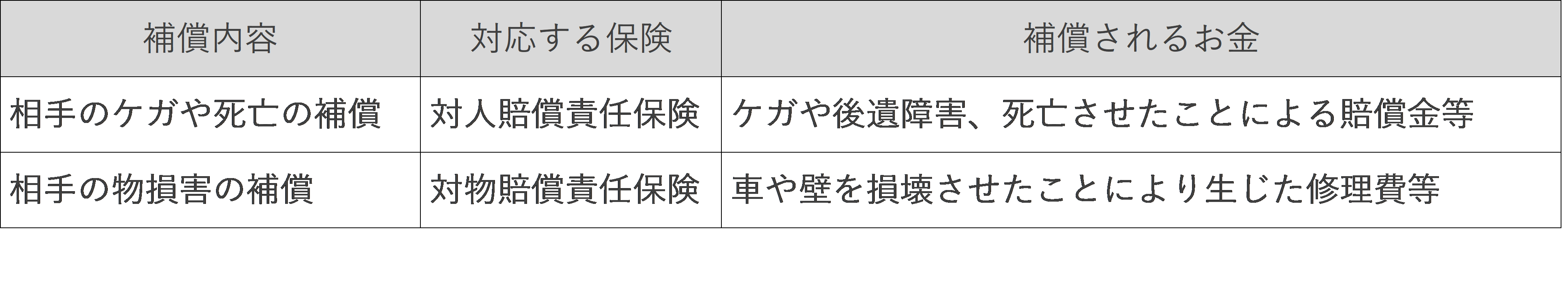 自動車事故で加害者になった場合に、相手方への法律上の損害賠償責任補償に対応する保険は、「対人賠償責任保険」と「対物賠償責任保険」です。