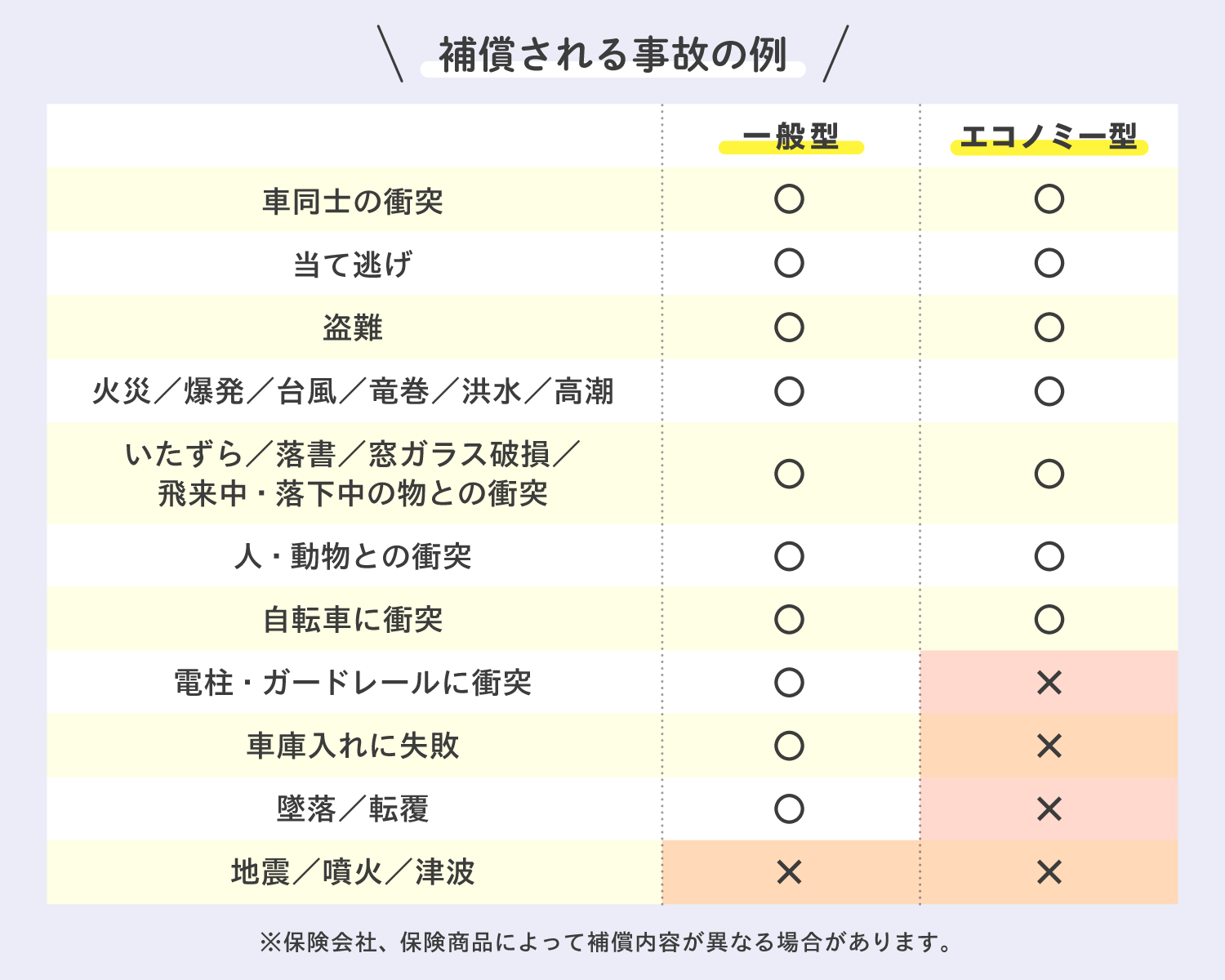 自動車保険の中でも、自分の車の損害分を補償してくれるのが車両保険。交通事故や自然災害、飛び石、駐車中のいたずらや盗難等により、車の修理や買い替えが必要になった時に保険金が支払われます。車両保険には、名称は保険会社によって異なりますが、カバーできる範囲が広い「一般型」と補償範囲が限定される「エコノミー型」の2タイプがあります。