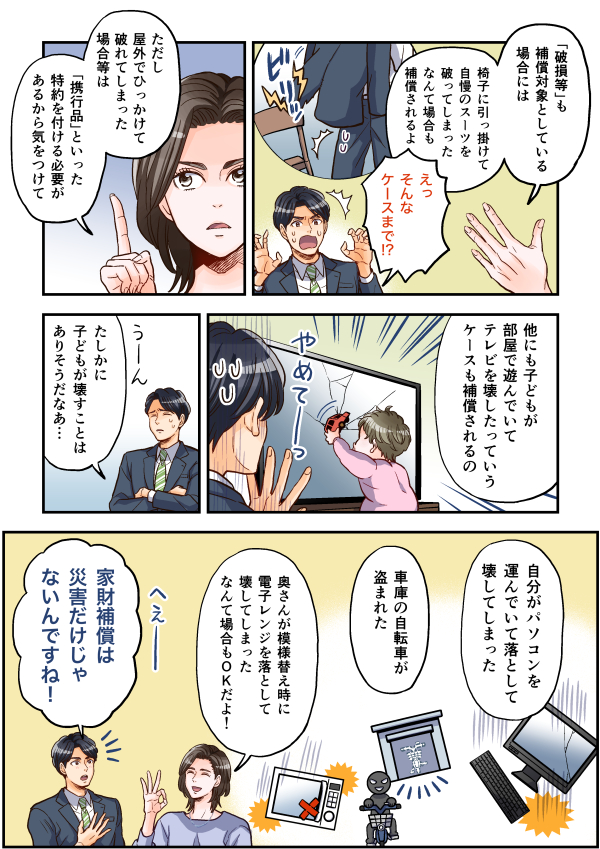 この漫画は、火災保険の家財補償についてのお話です。